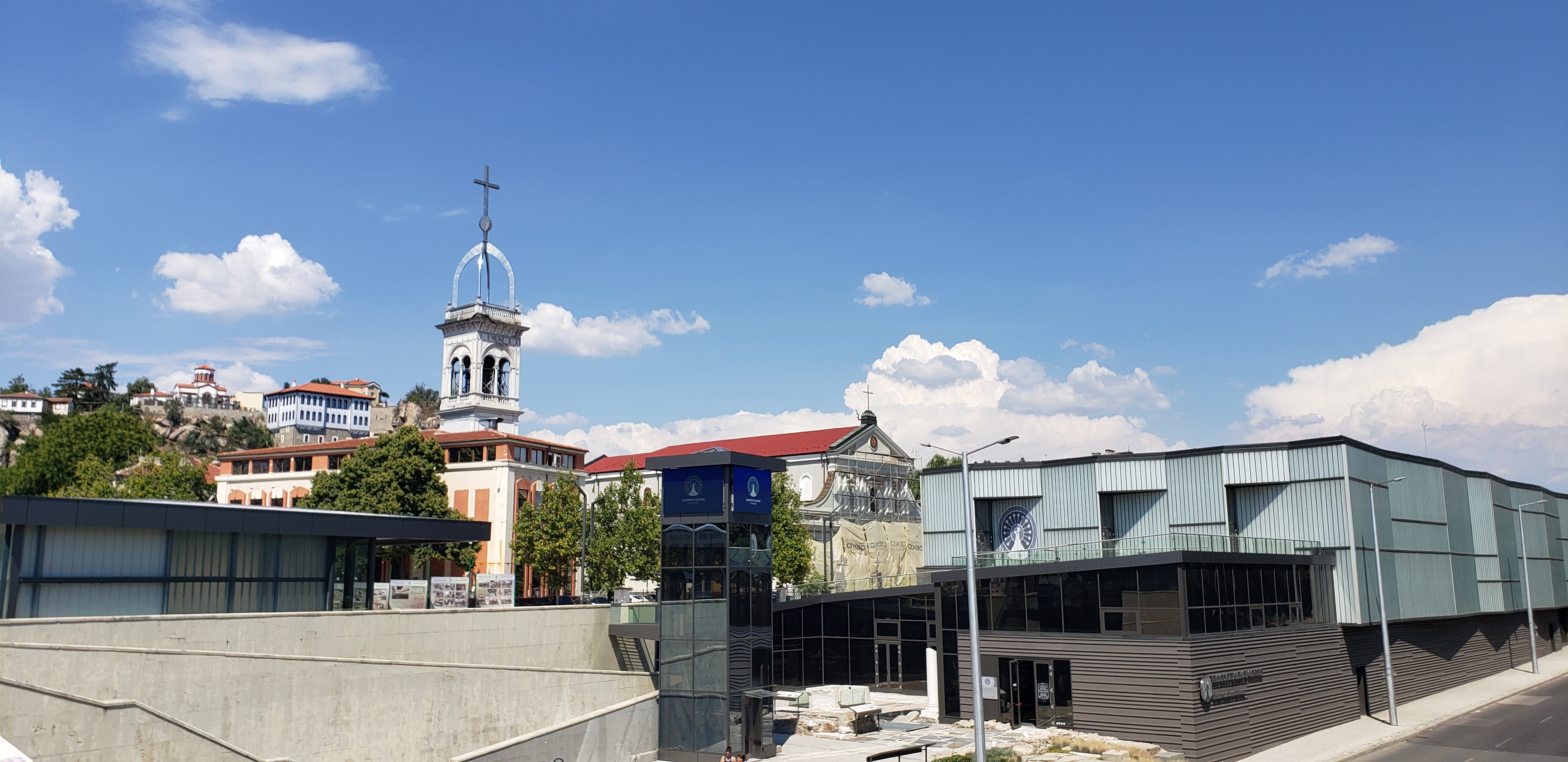 The hotel staff let us drop off our bags as they prepared our room, so we went walking nearby. Plovdiv was called Philipopolis in antiquity (a good sign) and there are lots of ruins that are quartered off with nice glass railings, as well as many buildings built in Byzantine times (see the partial one of the right below).