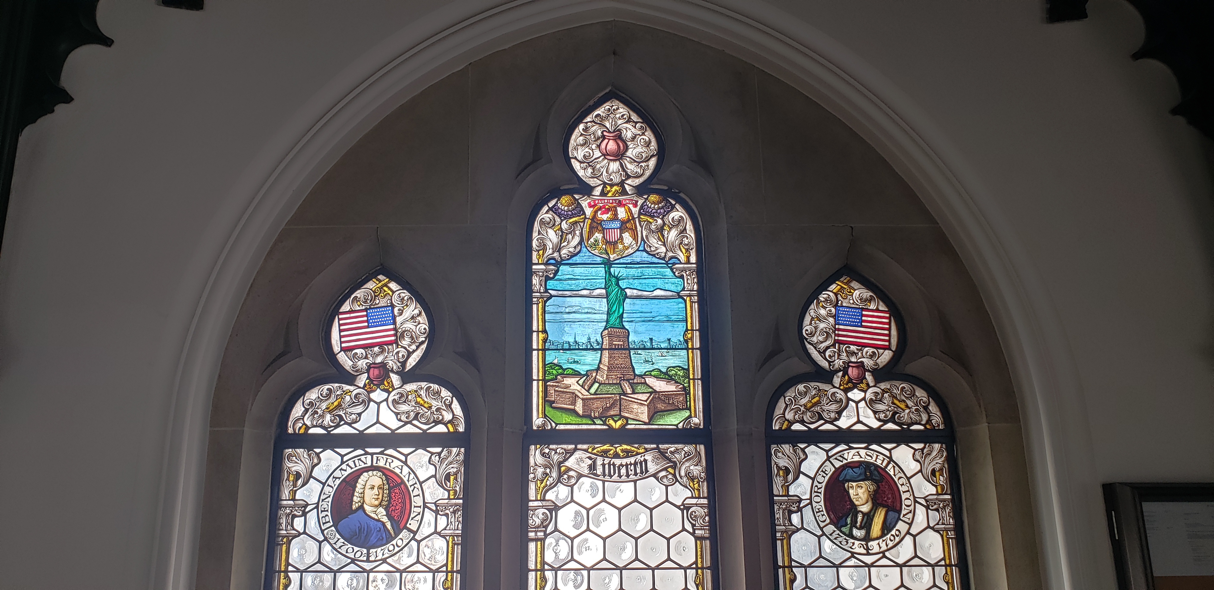 Finding some stained glass windows with an American theme (there were other countries represented as well):