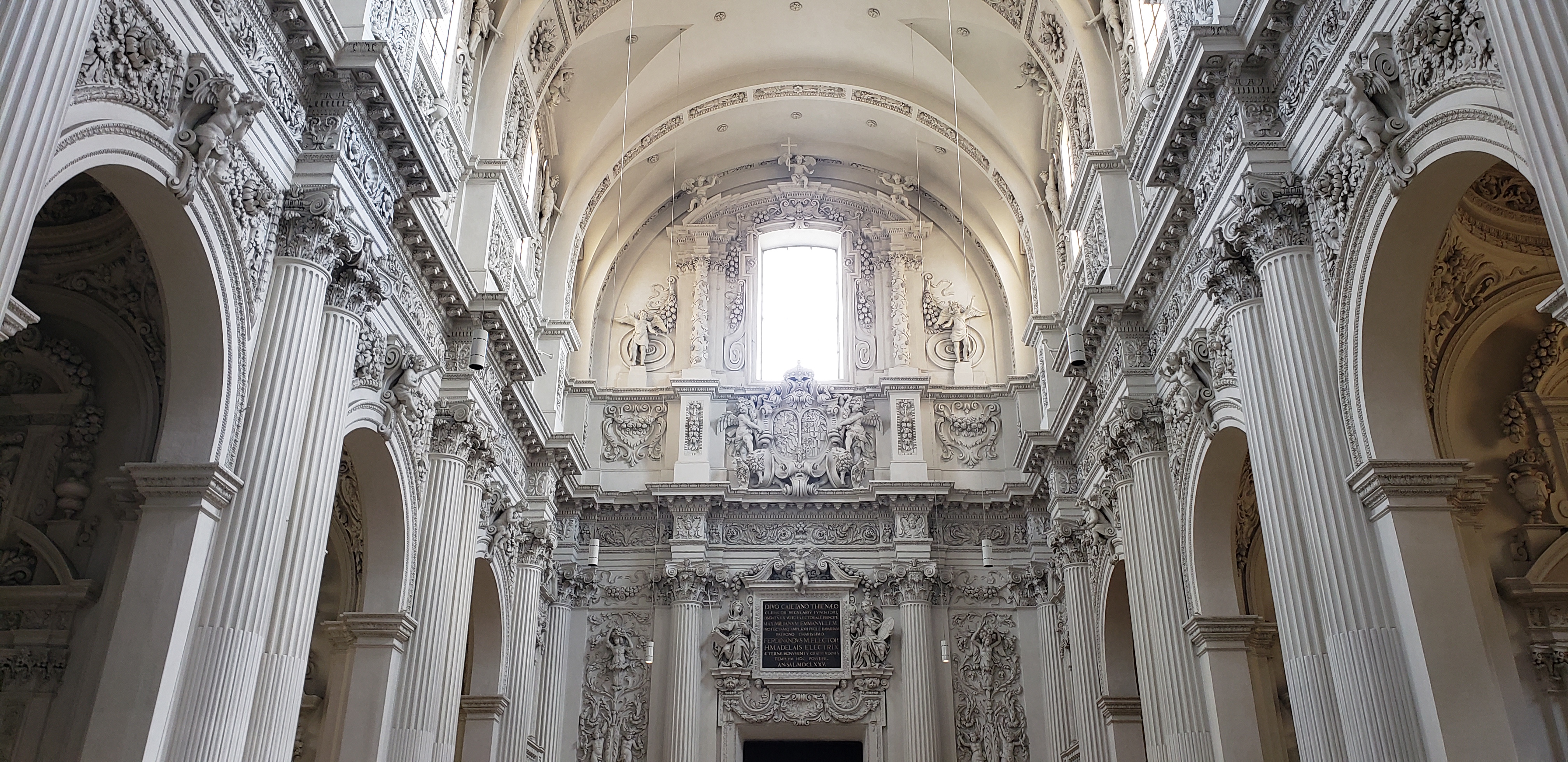 Inside the Theatine Church, built in the 1660s, was an interior unlike any we had seen; entirely stucco, intricately sculpted, and all bright white; the reliefs, altars, columns, everything;
