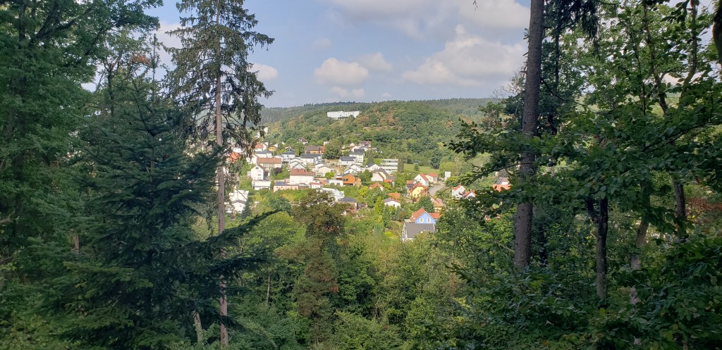 We arrived at the bus stop in the town of Donaustauf, from there we walked to the Sanctuary of St. Salvator. It was up some steep stairs, though it’s doors were locked and we could not peek inside. There was a path behind the Sanctuary that led into the forest; Jesse said let’s take it, and the compass agreed, so we did. The path took us higher and higher, and while we could not see that far in front of us, the map app assured us we were getting closer. We could see the town of Donaustauf below,