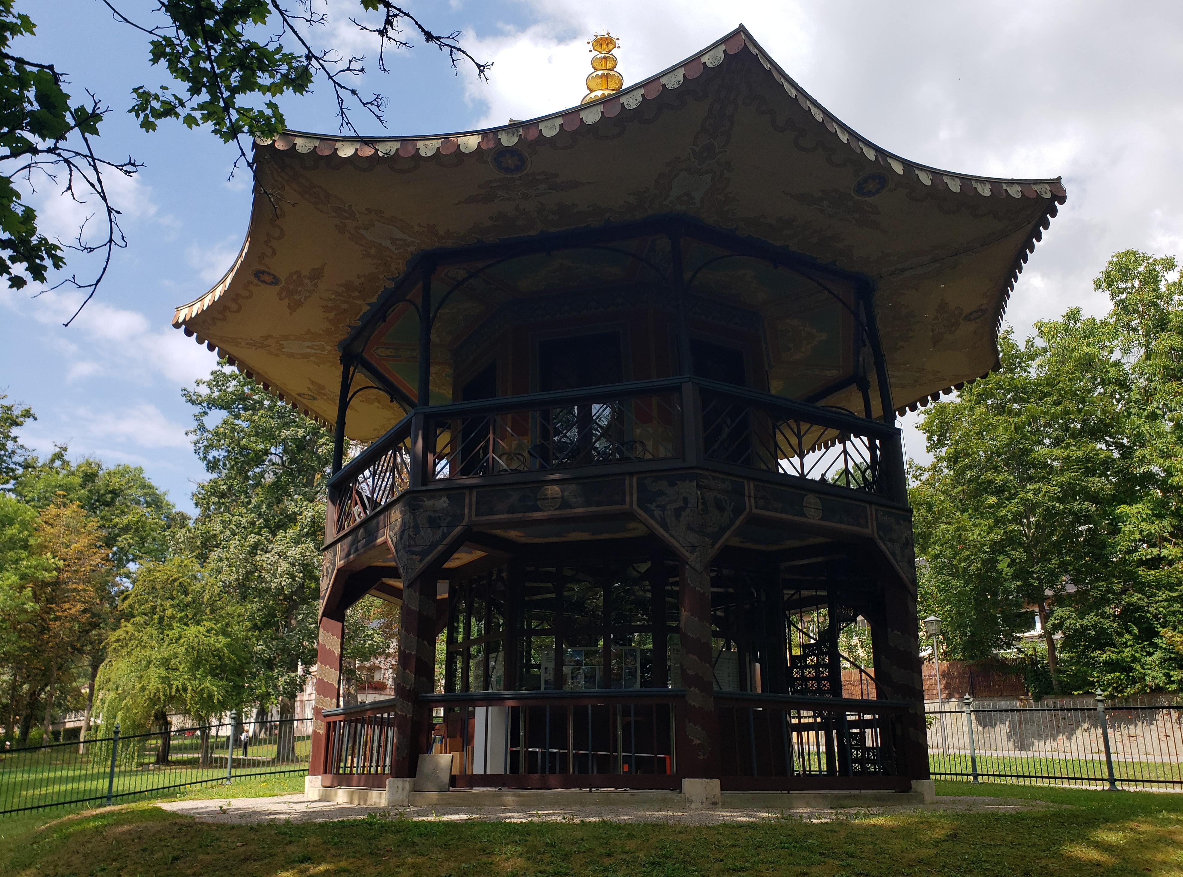 After we headed down the many, many stairs back to sea level, and a path that would lead us back to the bus stop in Donaustauf. We took a nice walk through the Englischer Garten to the center of the tiny own, and passed the Chinesischer Turm (Chinese Tower), originally built in 1800, and rebuilt later, in 1952. Now it was fenced off to the public, but still, an interesting and unexpected sight.