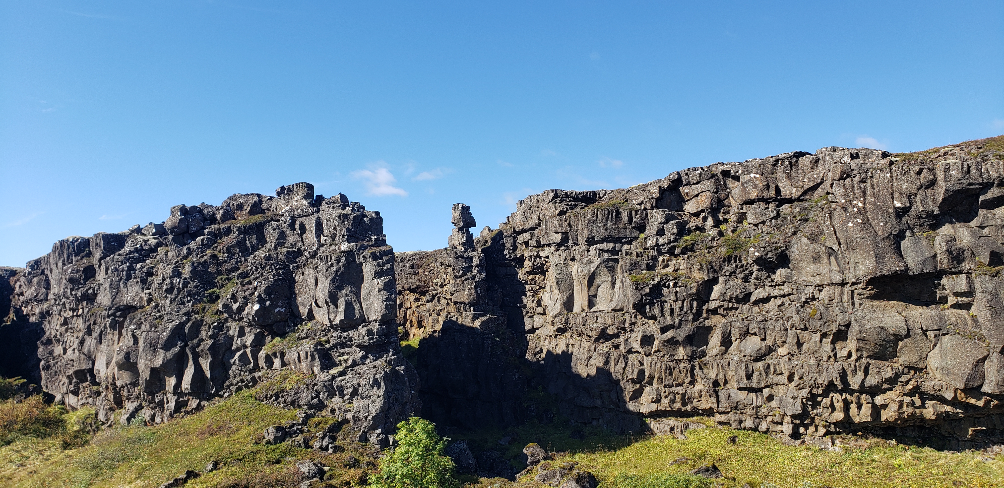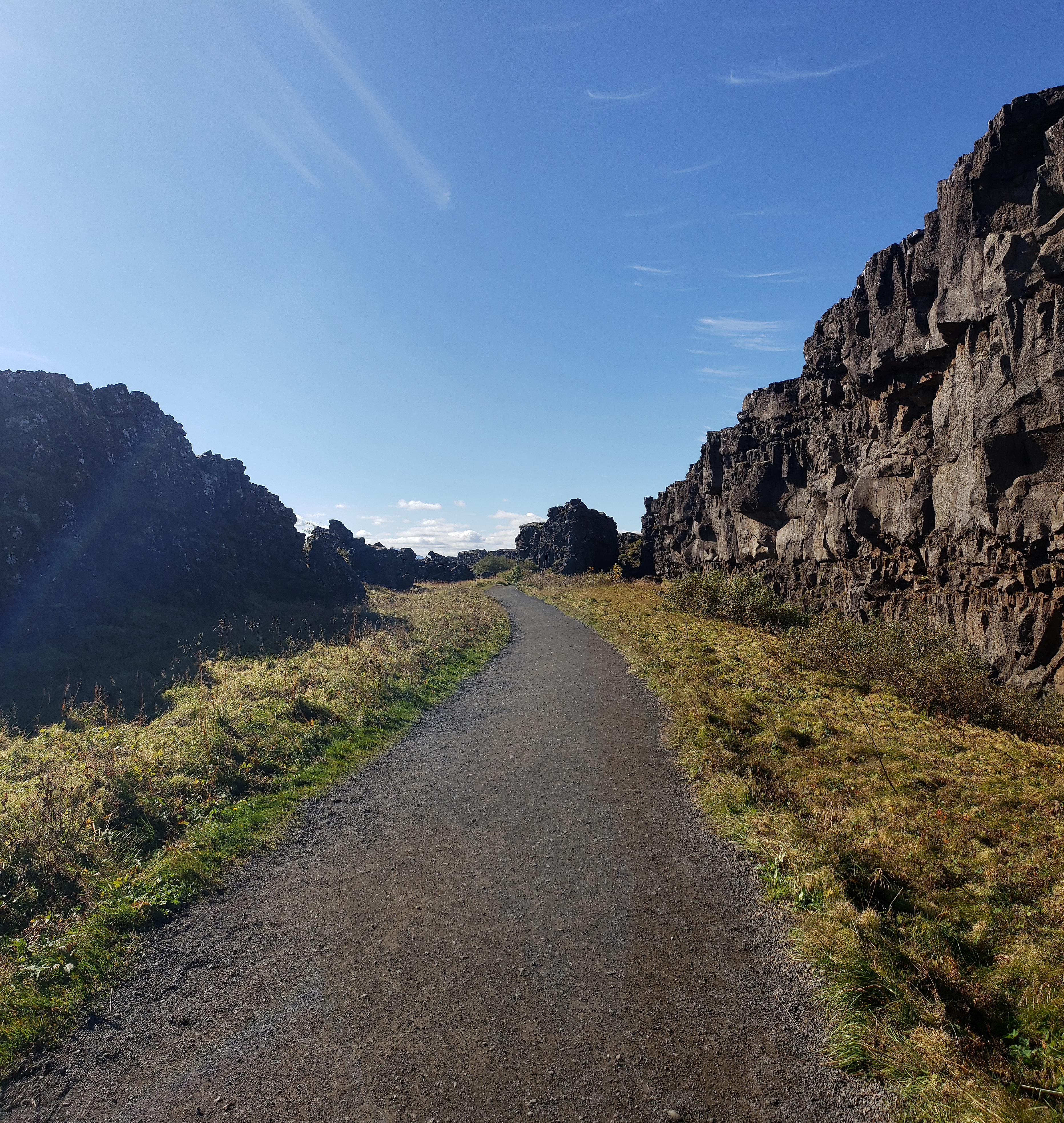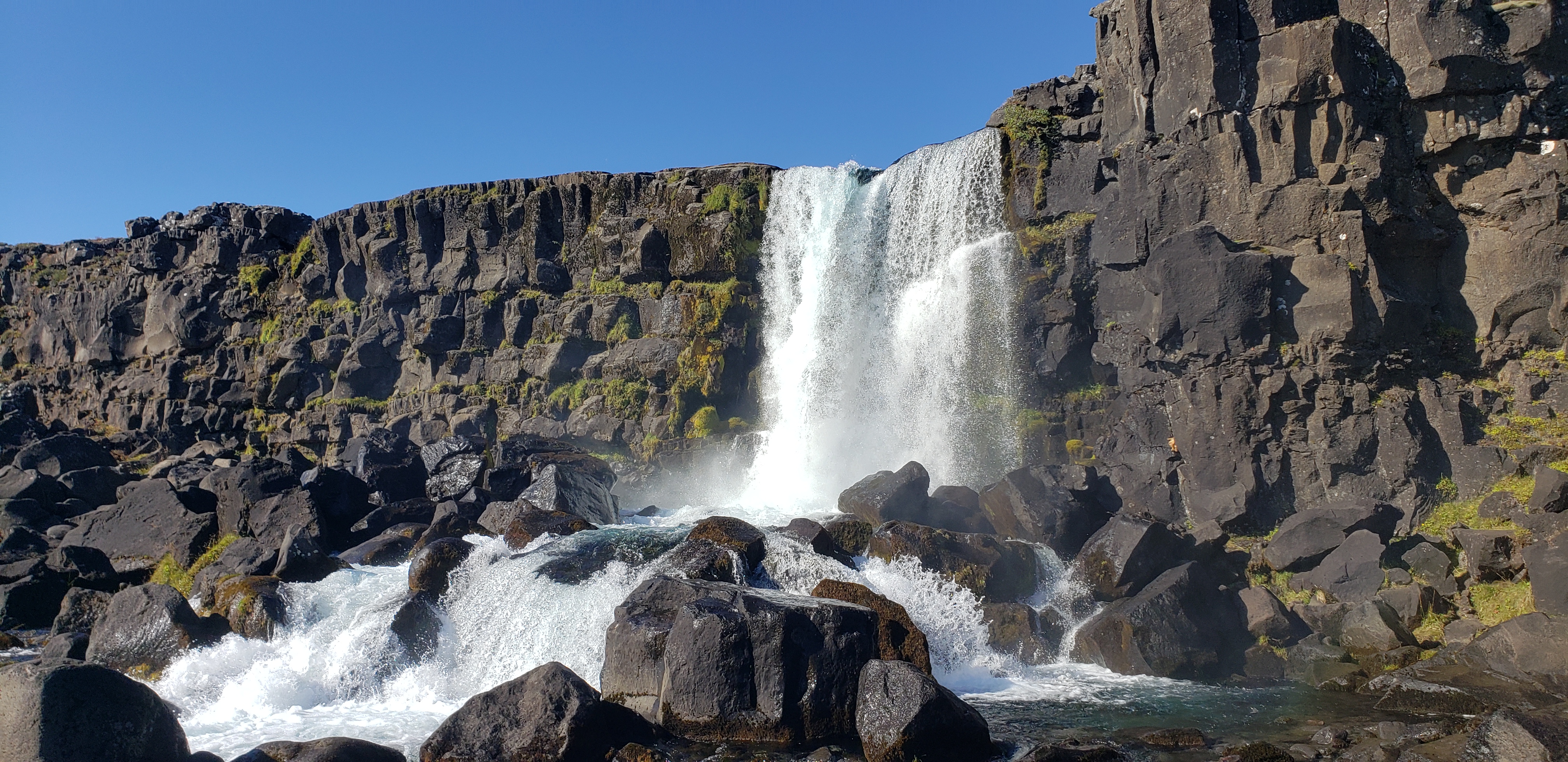 The church was closed by the time we arrived, so we walked a bit more in the area around our hotel before calling it an early night. The next morning we were on our way to south Iceland. As we only had a few days to explore, we decided the southern part of Iceland was the most accessible to us. Our first stop was the largest lake in Iceland, Thingvellir, and the national park of the same name. There is a large parking lot with bathrooms and a lookout point, but the parking was not free, and we avoided paying for parking during our trip, so we stopped and used the restrooms, and went on to Oxararfoss Waterfall. There, parking is free, and we walked between the large basalt rock formations on a nice, laid out path;