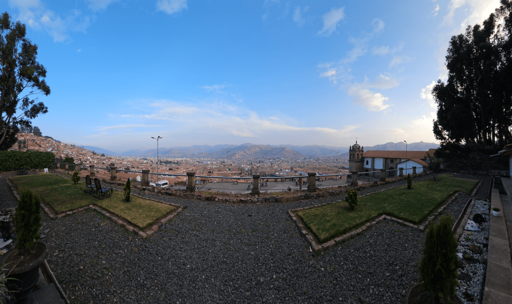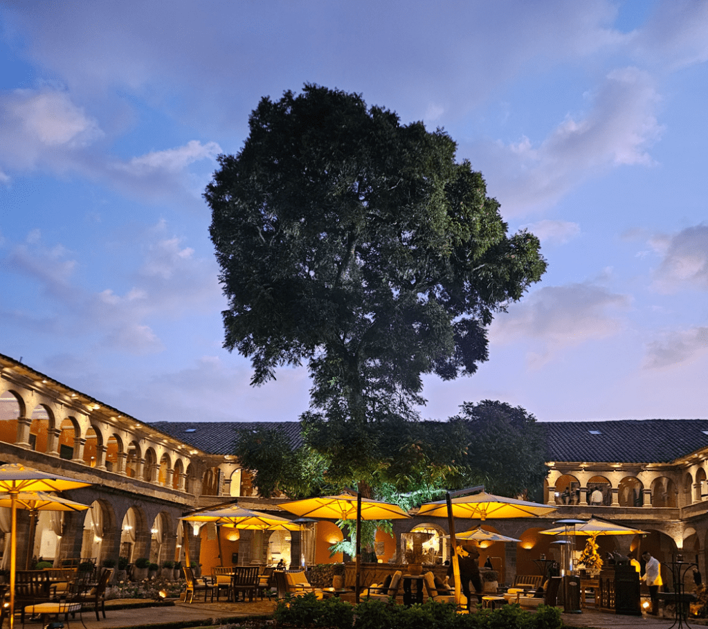 We returned at dusk to the hotel, providing an excelling view of the courtyard and the 300-year old-Andean Cedar Tree, the last of its kind in Peru.