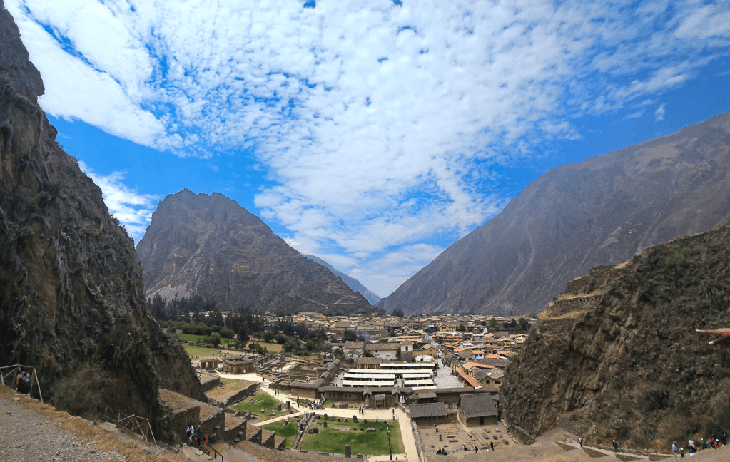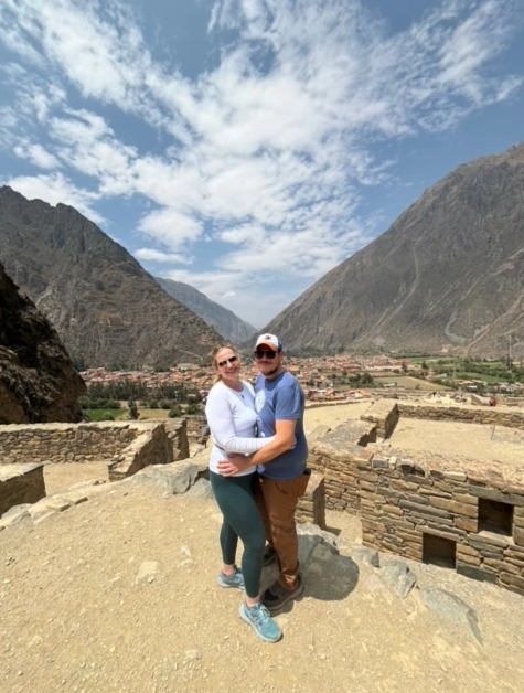 Our next day was a trip to the nearby Sacred Valley, which was an important part of the Incan Empire and on the way to and from Machu Picchu. Stretching from the village of Pisac to the town of Ollantaytambo, following the course of the Urubamba River (borrowed from Jessica’s blog), we visited Ollantaytambo first, which is really hard to say, even though you can sound it out (there’s a lot of syllables). Originally an Incan and pre-Incan fortress (we learned a lot about pre-Incan culture throughout our travels). It is a truly breathtaking area, here’s the view looking back from the main site, with the walk up view to follow (and Jessica and I in front of both):