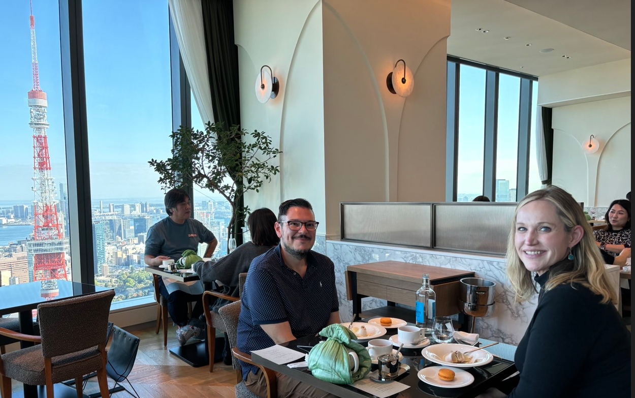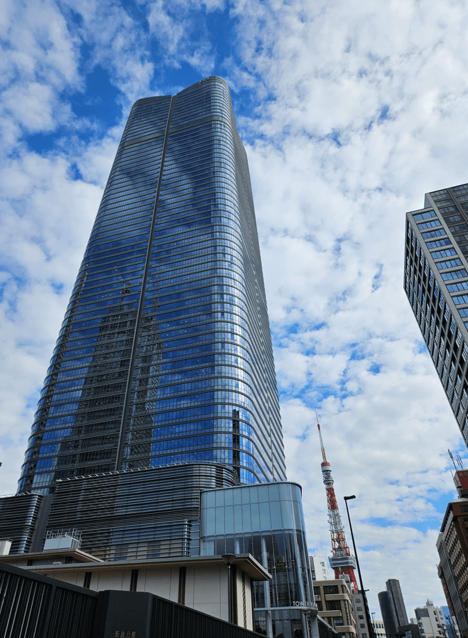 We had lunch reservations at the posh Hills House 33 restaurant in the high-end Roppongi neighborhood; the restaurant was on the 33rd floor (duh, I later thought) of the building below (that’s Tokyo tower behind it).