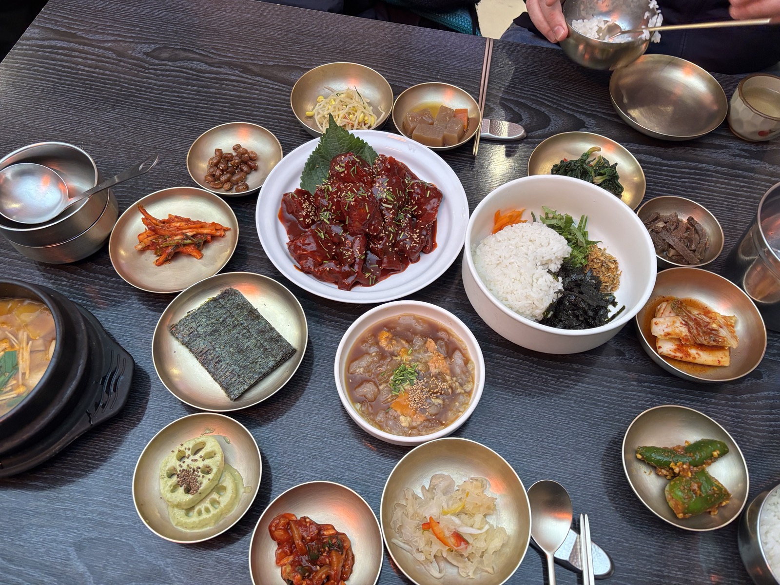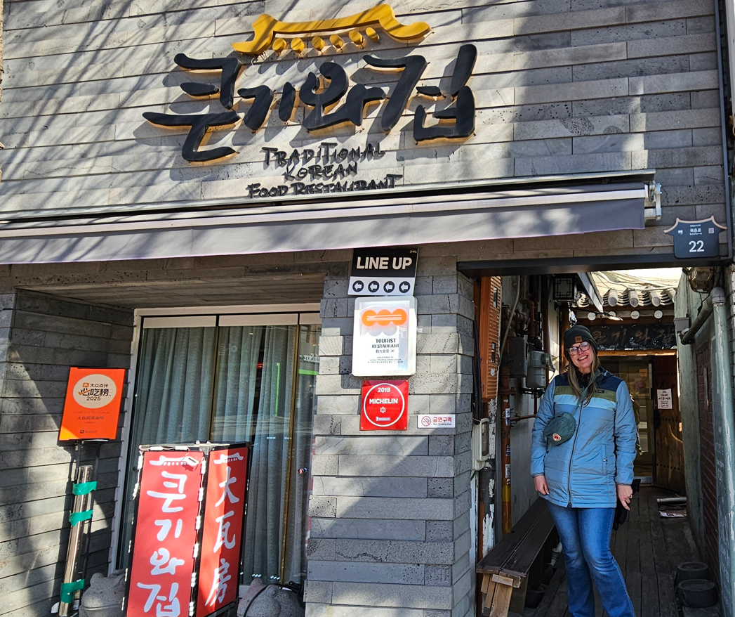We were getting hungry, and saw a restaurant we had previously pinned, and headed toward it. Keunkiwajip specialized in crab dishes as a traditional Korean restaurant, and even had earned a Michelin Star back in 2018; we ordered the spicy marinated (raw) crab, and a cooked crab dish to share; they brought us both along with all the sides (kimchi, bean sprouts, assorted pickled veggies, cooked peanuts, gelatinous cubes – tasted like Italian beef from Chicago, oddly, and other treats) and we ate (almost) all of it.