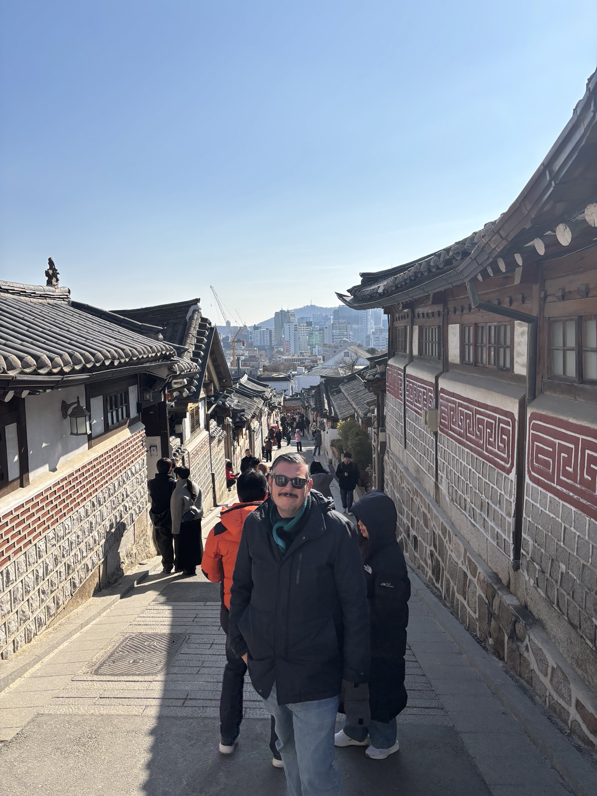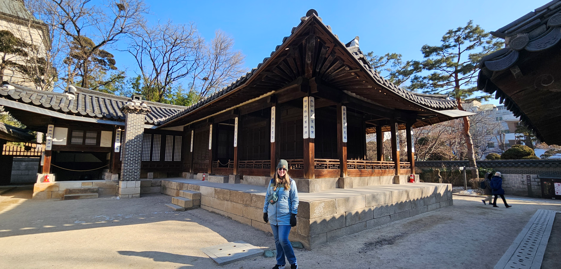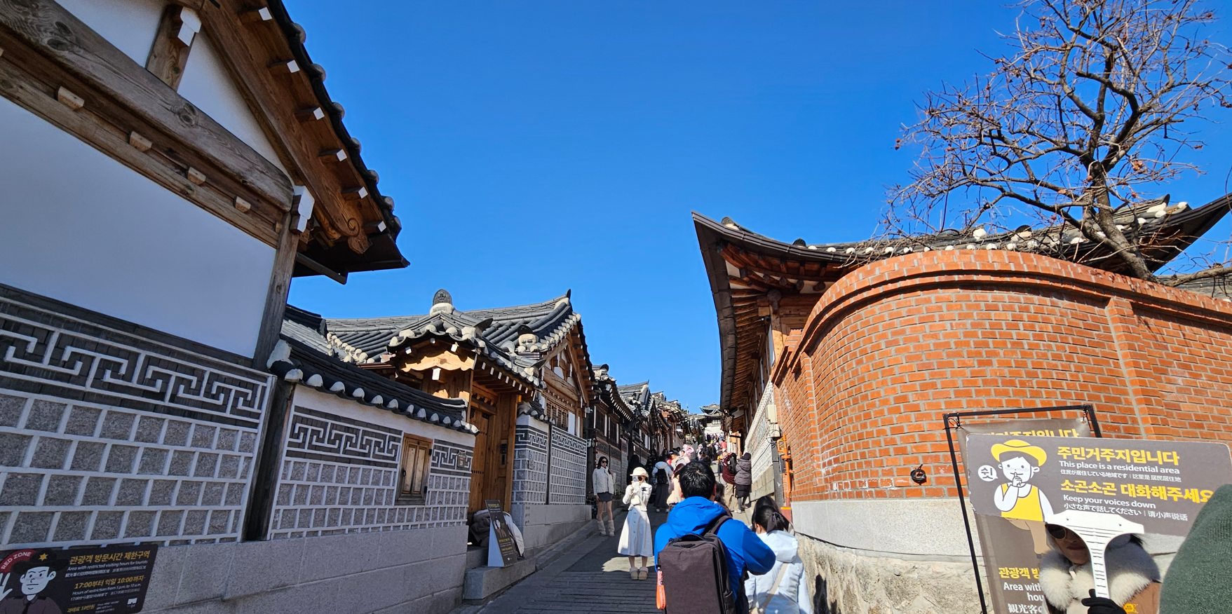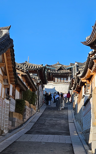 Now full, we headed back into the cold, and onward to the Bukchon Hanok village, which has many Hanok style homes, which we later learned on our tour the next day belonged to the ruling class of the Emperor. It is very hilly, so lots of up and down streets, and people still live in these homes (they are very expensive), so there are signs all over to keep quiet, and the area is closed to tourists after 5pm.