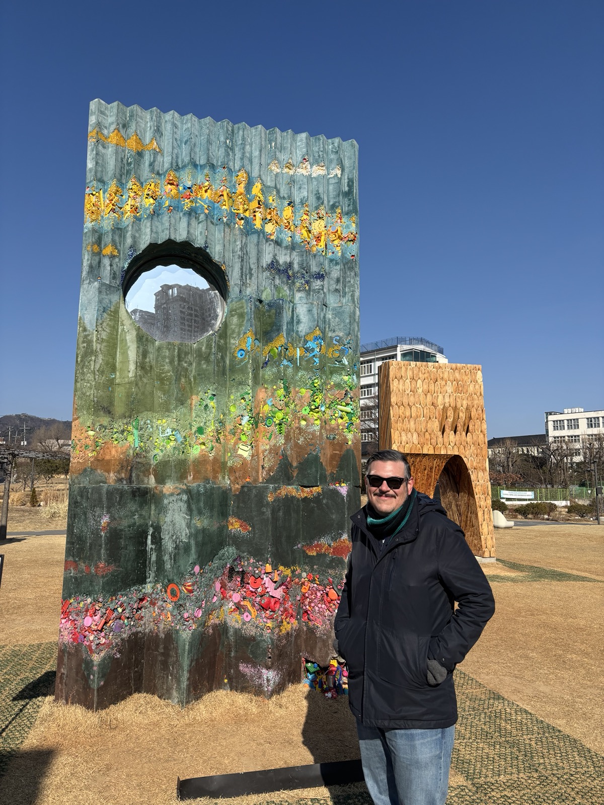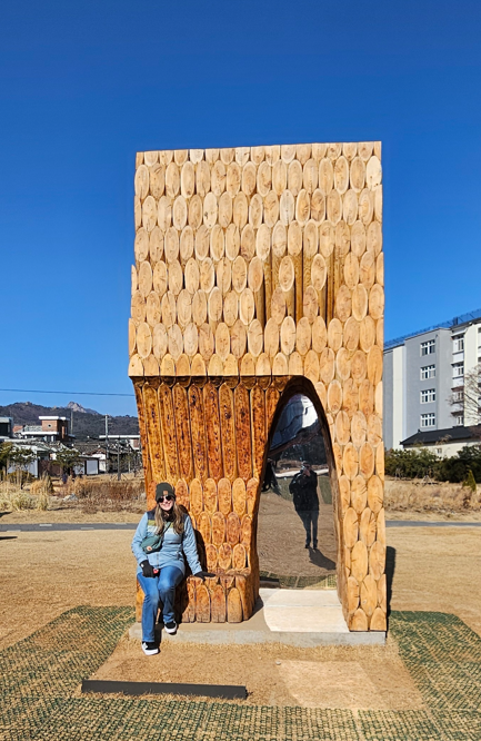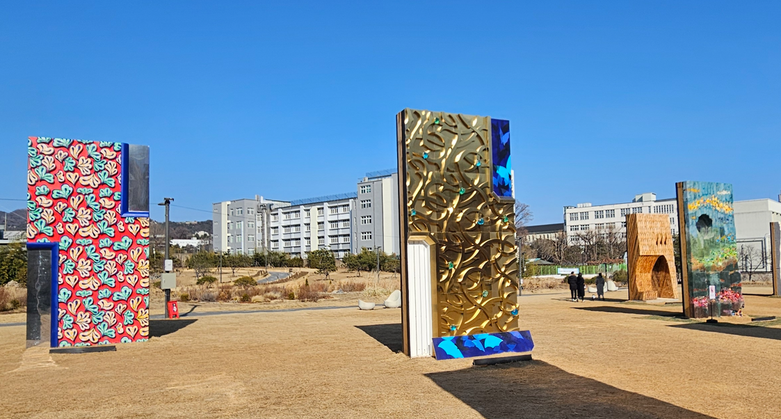We were far from our hotel, but the sun was still shining, and we didn’t feel like dealing with public transport yet, so we started walking back. On the way, we happened upon an art installation in a large park (the Songhyeon Green Plaza), called “Walls of Public Life” made up of 24 walls (16-feet tall by 8-feet wide), designed by different artists.