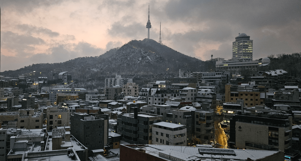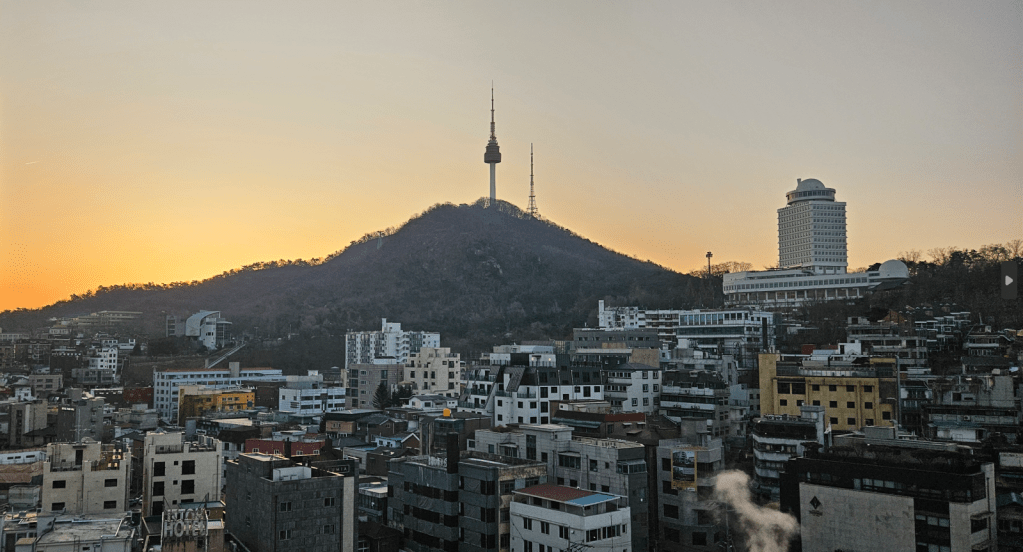 So we bundled up and headed out; it was cold, but sunny, and that makes a big difference. We were staying in the Myeongdong district of Seoul, where there are many hotels and lots of shopping, and is popular for first time visitors. Below is the view from our hotel, of Seoul Tower, and we took many pics of it at different times of day.
