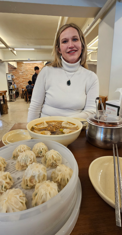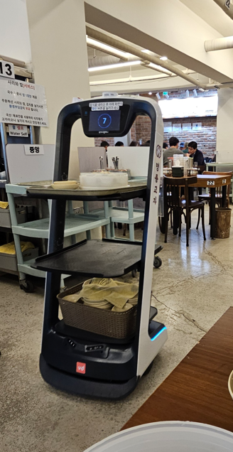 On the way we passed another spot that people seemed to be entering at quite a pace; so we joined the queue and were soon ushered up a flight of stairs into a large eating space where robots were zooming around with plates of food. This must be the place, we thought, as we chose two of four total dishes they served, were told to pay immediately, and sat down. An excellent part of much of Korean dining is the drawer under the table that houses the napkins, cutlery/chopsticks, and bottle opener. Very quickly (we learned Korean food is served fast, and they eat fast and get on their way) we received our dumplings and Kalguksu (noodles with ground meat in broth) steaming hot, brought to us by the robot waiter.