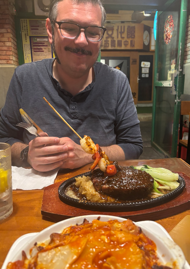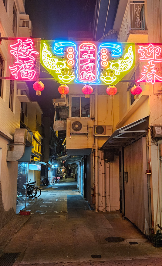 After sunset we went looking for dinner, and Michael had recommended Wang Kitchen, so we traversed the mostly empty narrow streets, and were treated to an excellent meal of Hong Kong style sizzling steak and baked pork chop with pineapple and fried rice, covered in cheese (it tasted like a Hawaiian Style Pizza).