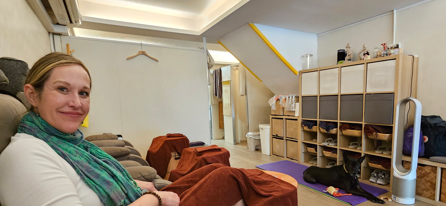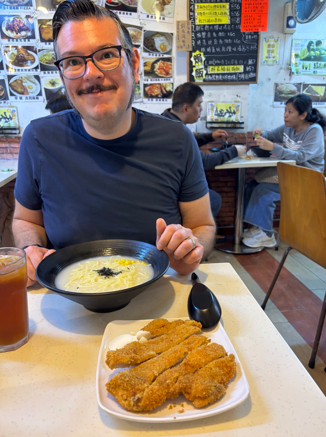 It was us and a lone fisherman, using his hands as a rod, It was so peaceful and serene, and the water so blue, it was hard to leave. But it was lunchtime, and we needed to checkout of the hotel, so we did, left our bag, and went searching for a good spot. We tried a few of the places Michael had mentioned, but they were closed, as we were nearing Chinese New Year, so ducked into a little place and ate some noodles in broth and fried pork cutlets, before getting a steam foot massage at a place Michael recommended, which was much needed. We even got to pet the Parlor dog named Ninja and another couple came in with their dog, a cute Jindo named Dau Dau.