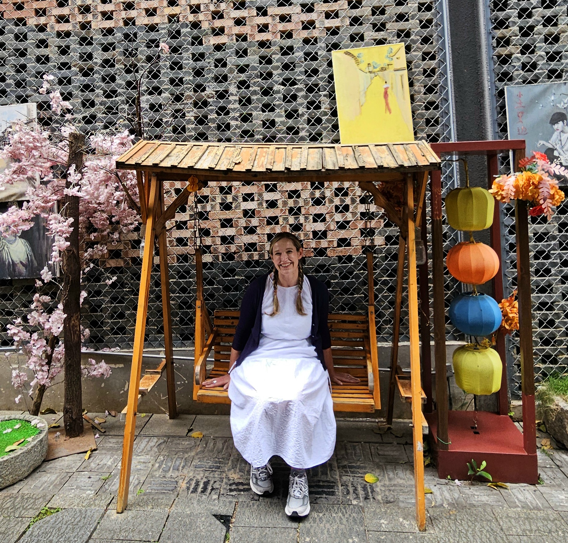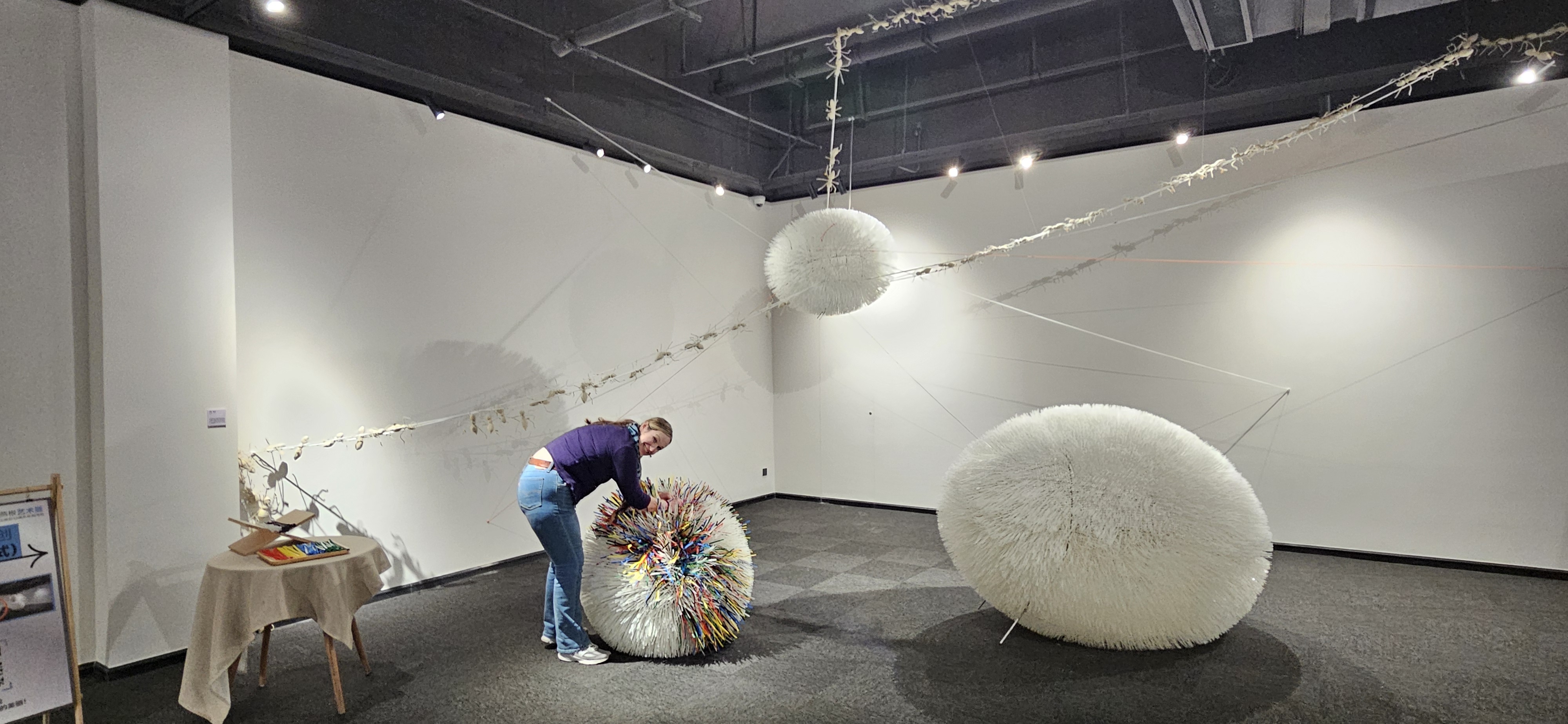 The art gallery in the basement was small yet interesting and worth a visit if you’re stopping by the bookstore. The featured artist is named Zhang Yangen, and there was even a piece we could contribute to, as Jessica is doing below.