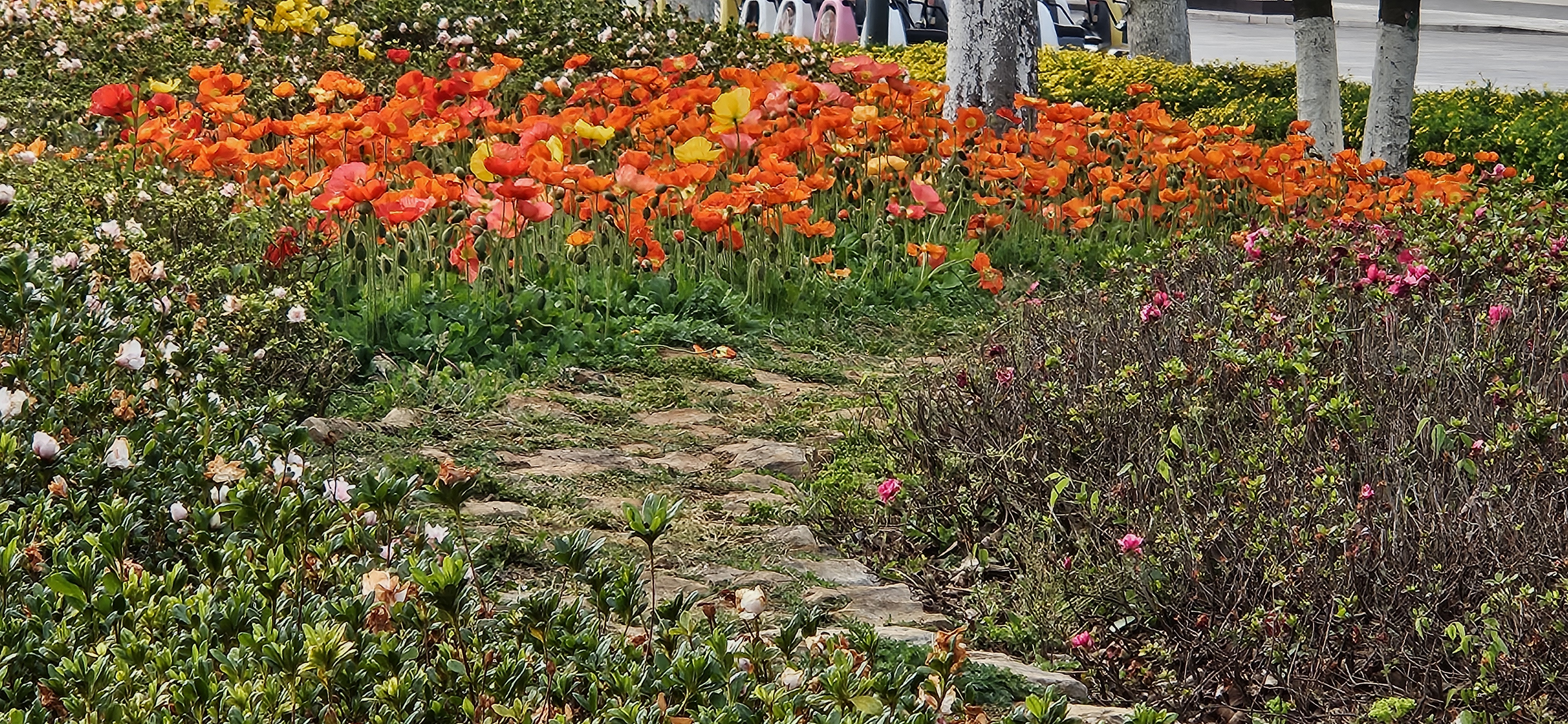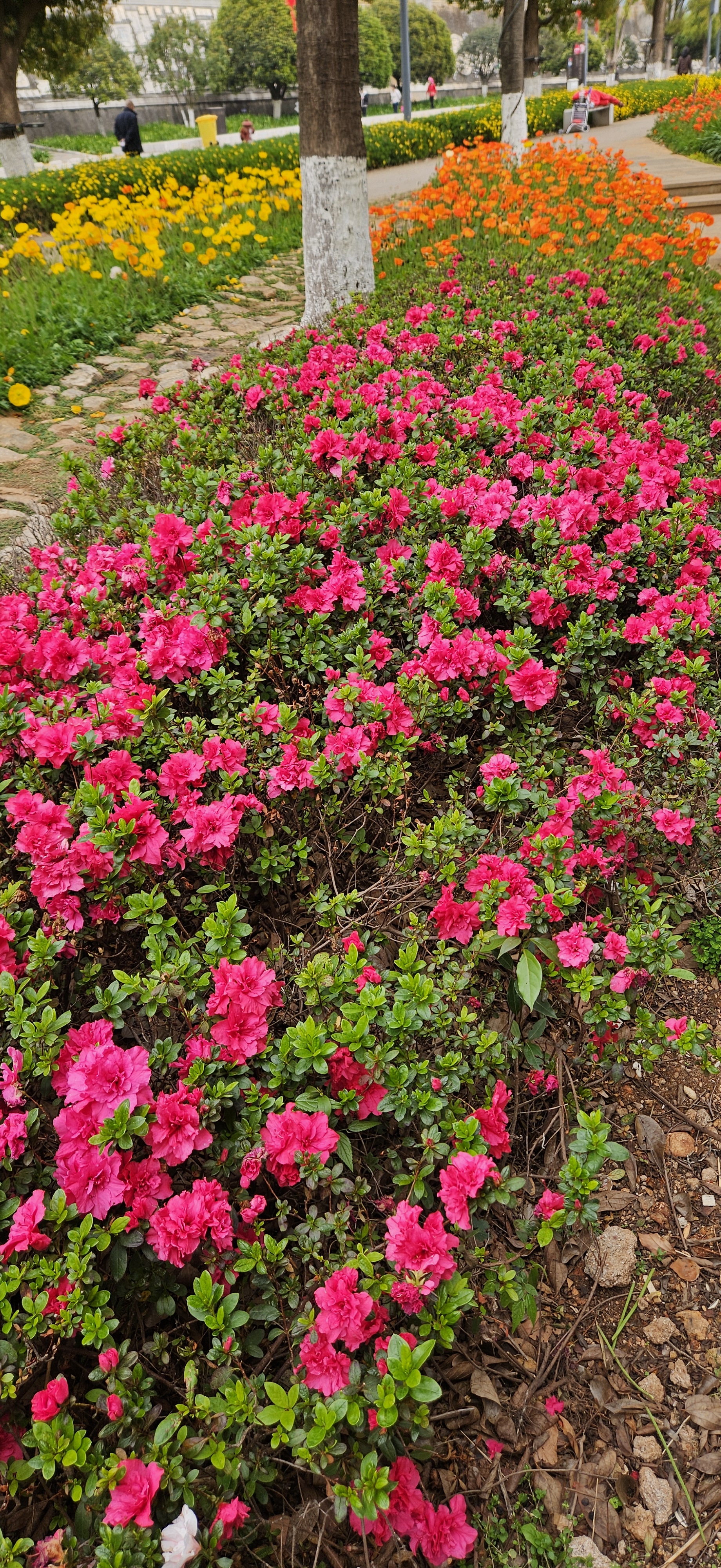 We walked under the big gates, past the elephants made of plants, and saw all the beautiful flowers blooming. First we saw the poppies, bright orange, red, yellow and the bright magenta azaleas;