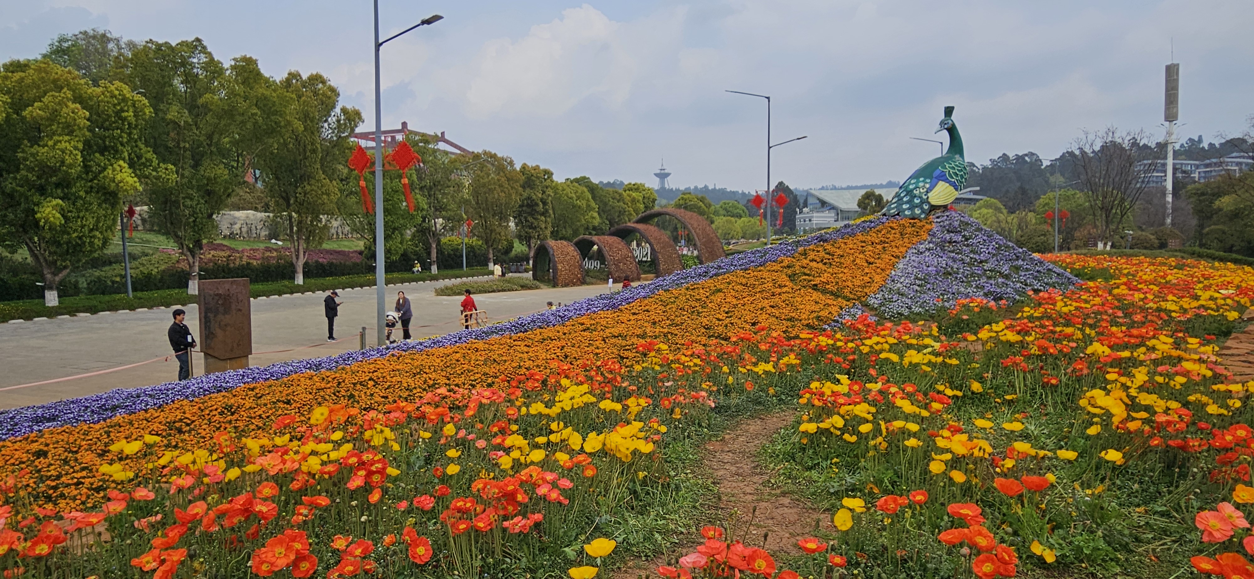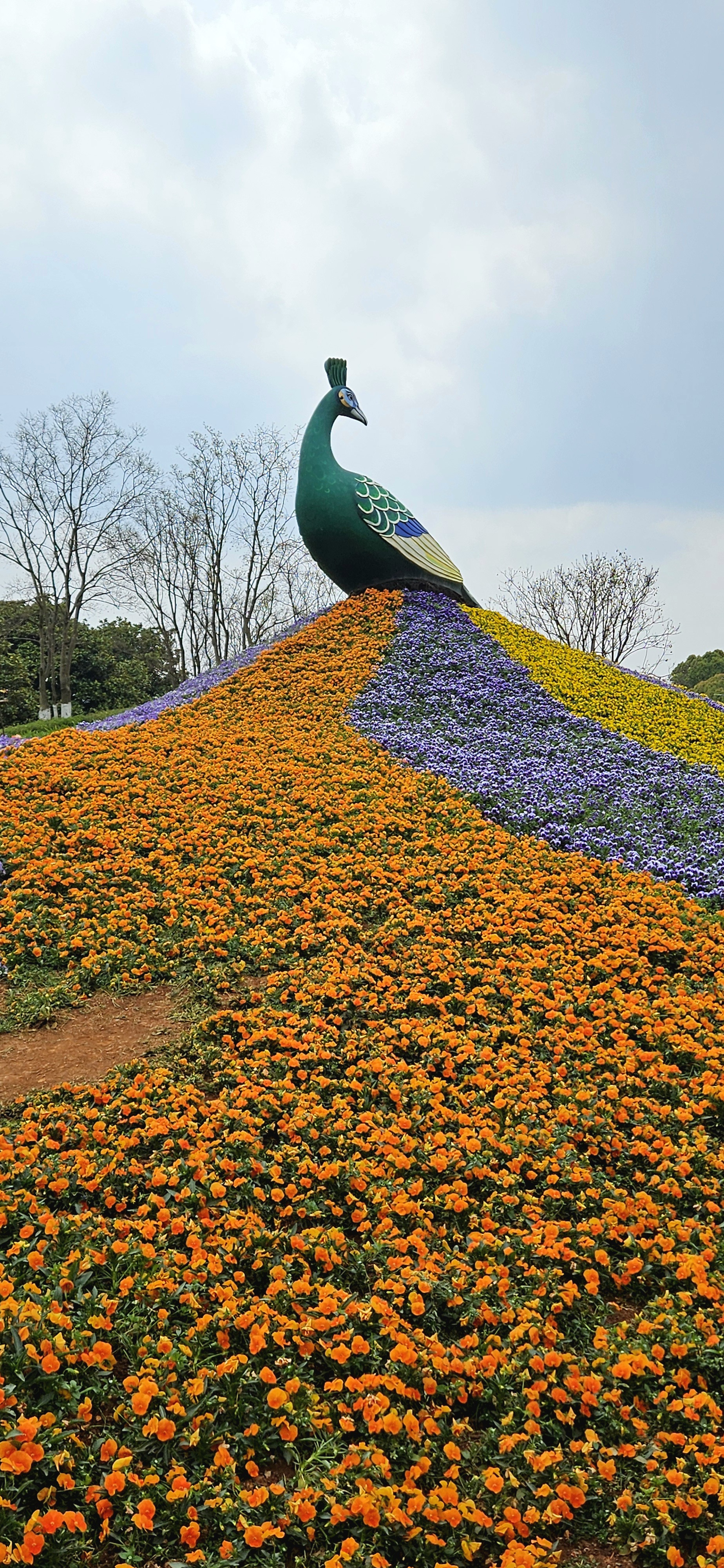 All leading up to the Peacock statue with its tail made of purple, yellow and orange flowers.