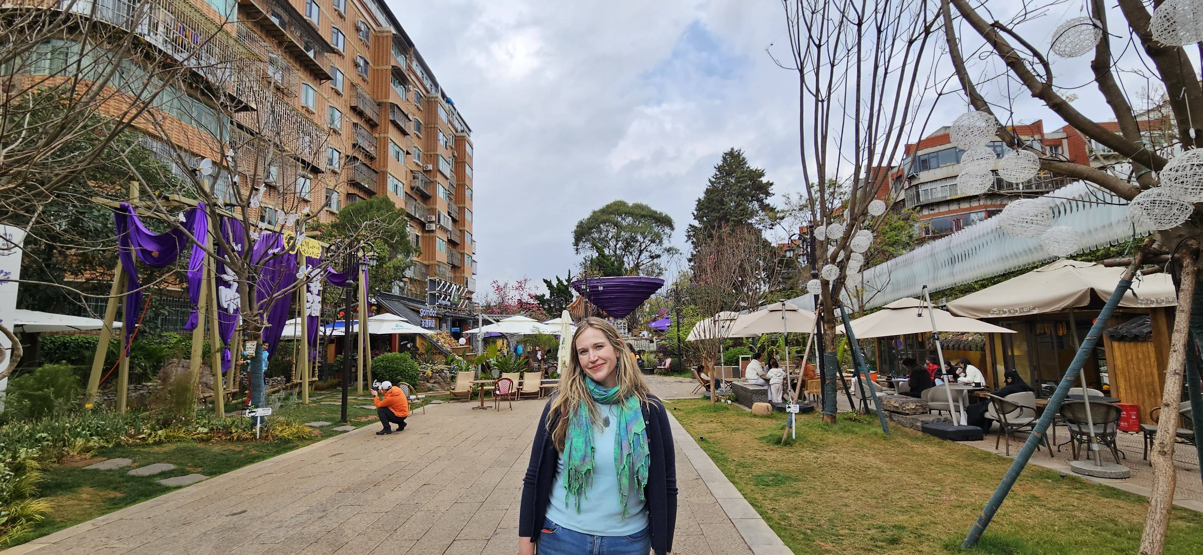 We left the temple and started walking back toward the hotel, making an impromptu stop at Coffee Alley, which was near Green Lake Park. Coffee culture is coming to many Chinese cities, and this area in Kunming was quite popular with Chinese tourists, who were taking pictures throughout. Of course, we had to join them, as the backdrops were pretty cool.
