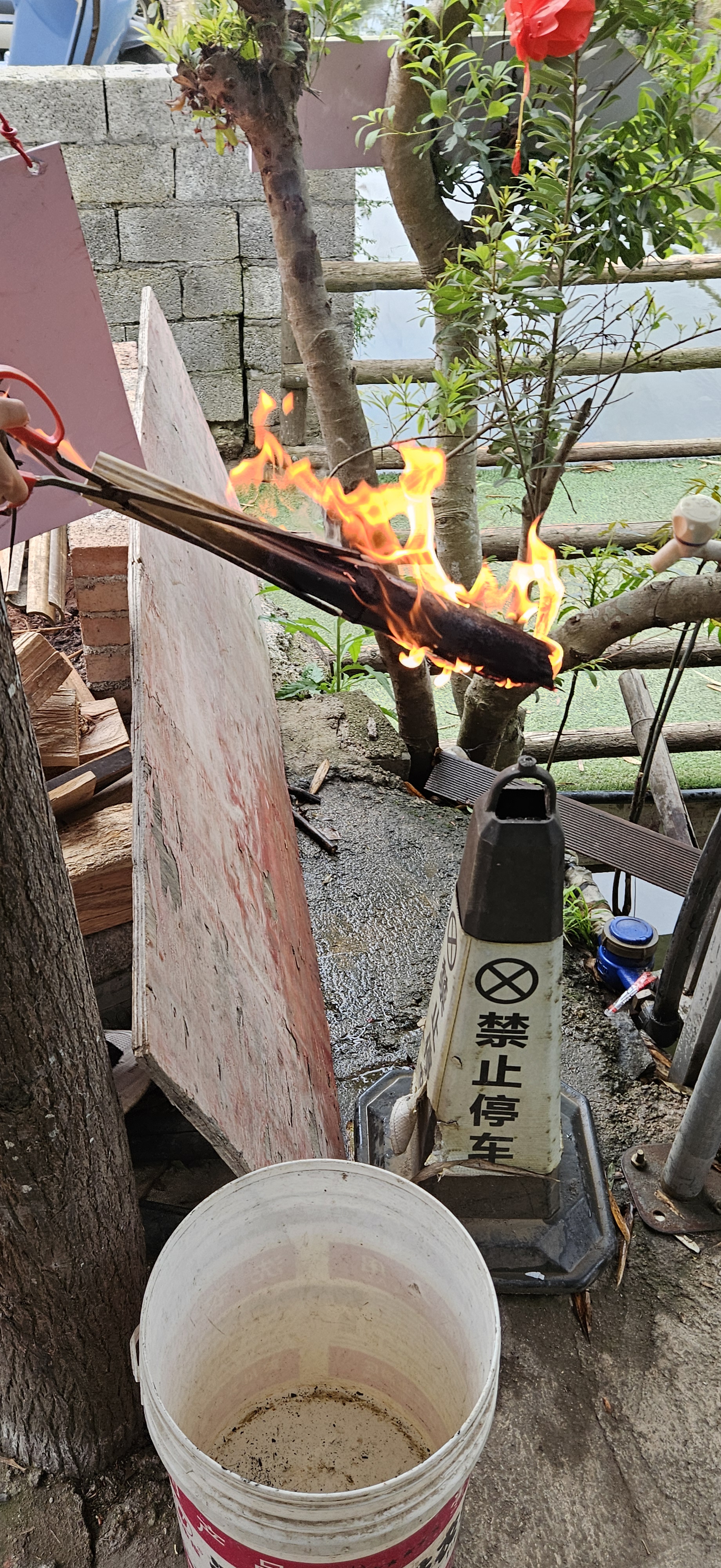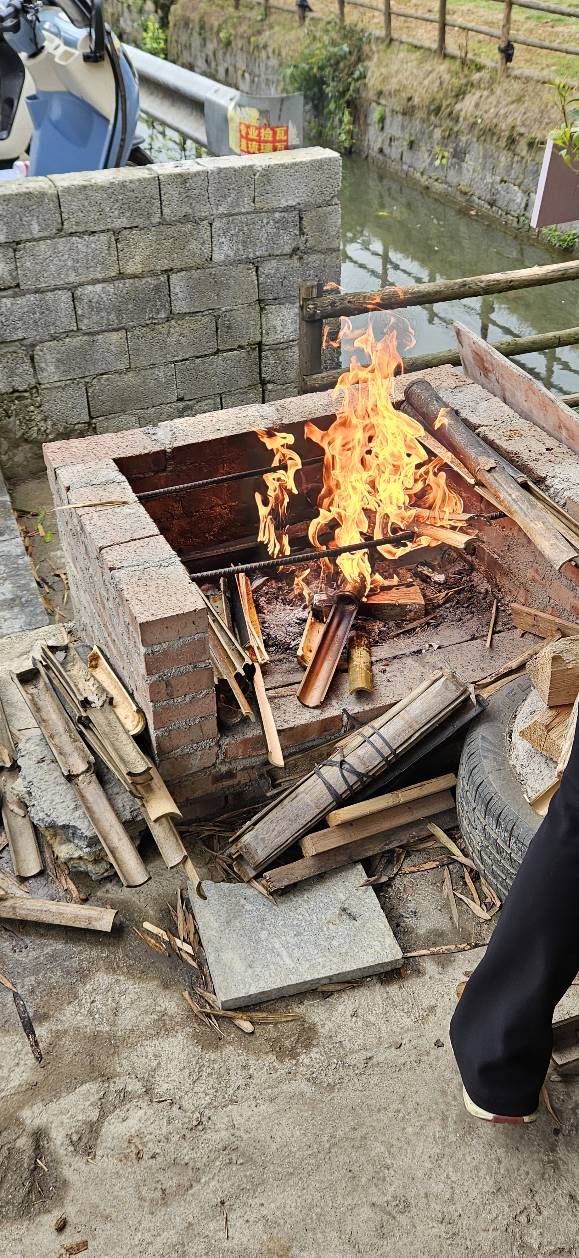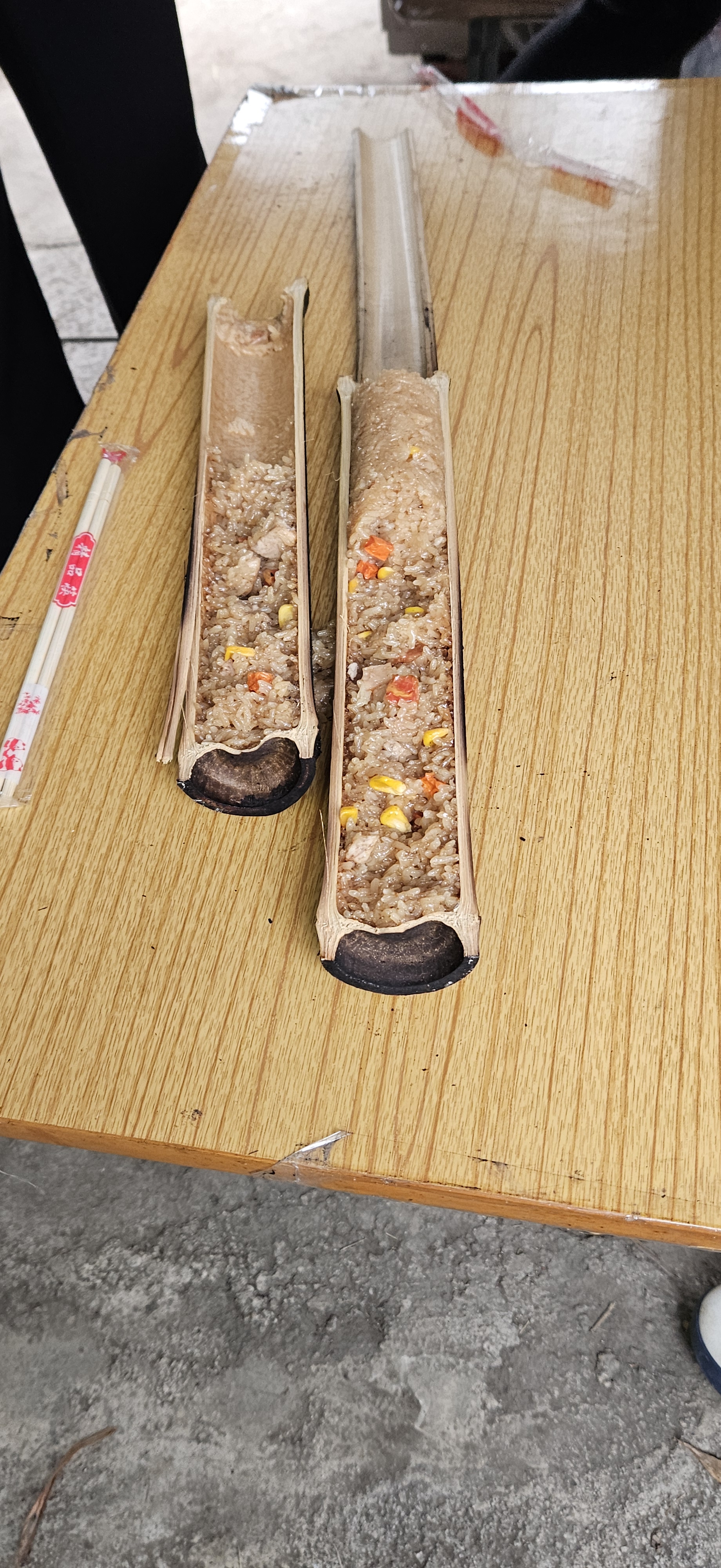 We looked back toward the river before returning to the main road, and ate a sausage on a stick from the food stand across from our hotel. The sausage on a stick has become a favorite quick snack here in China, and they can be found everywhere. Usually they will add some spice mix if asked to give it some more flavor. We also saw big bamboo tubes being cooked in a fire, and wondered why; luckily, a family had ordered one, and we learned it contained rice. We never tried it though, as we figured it would be too dry.