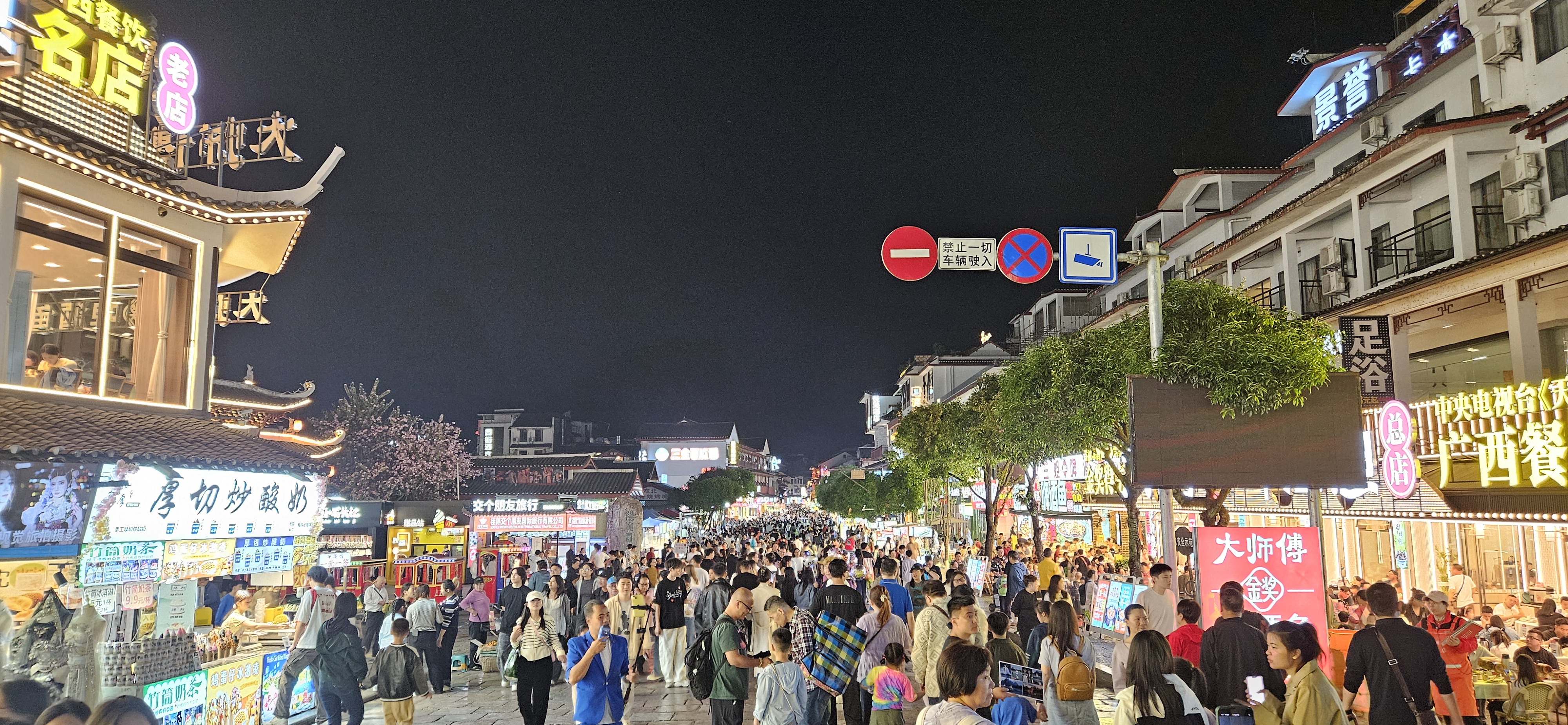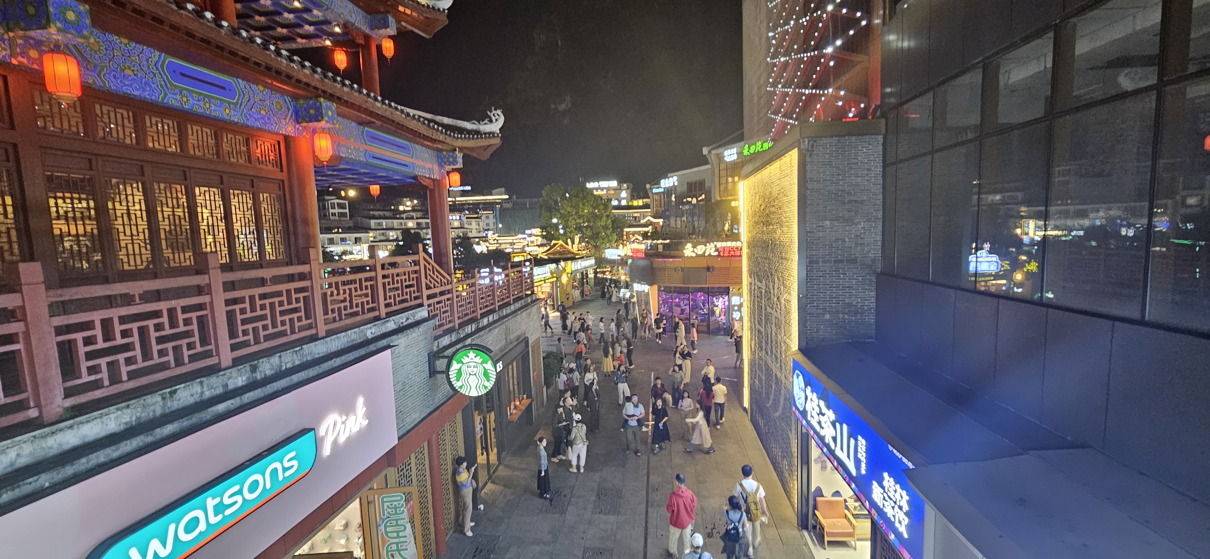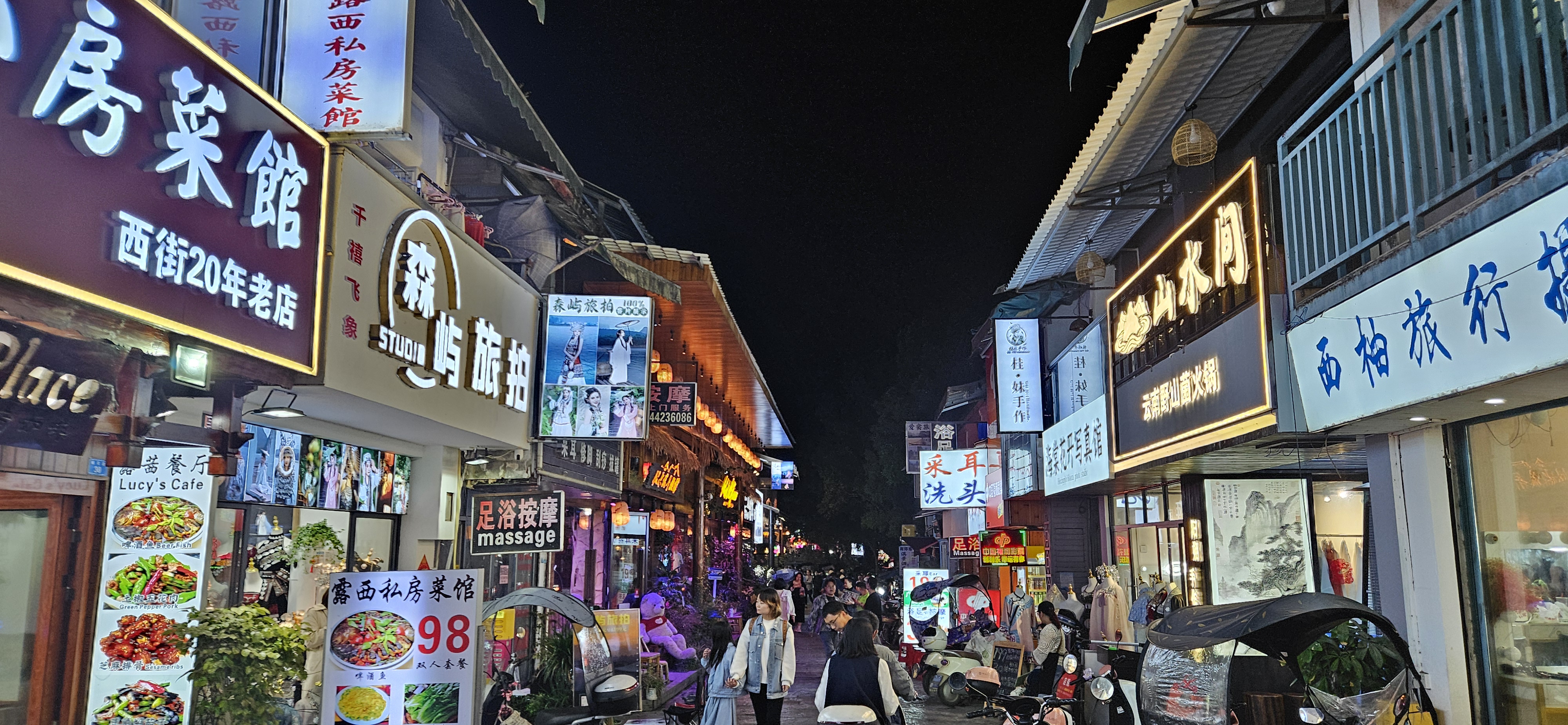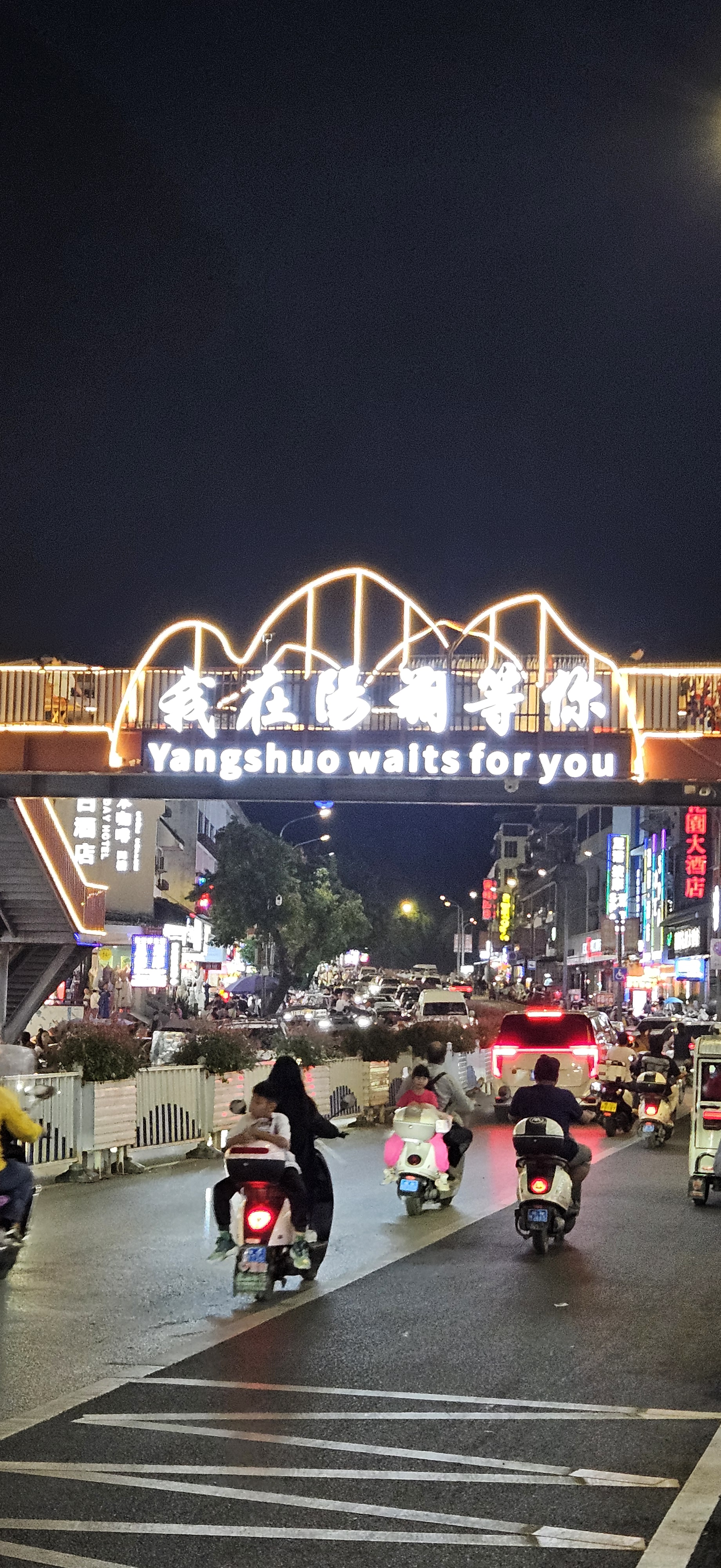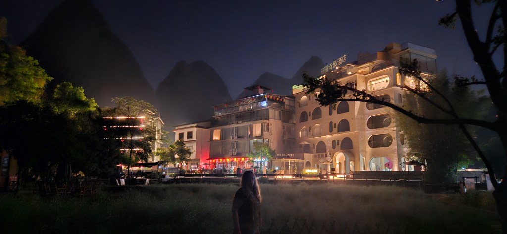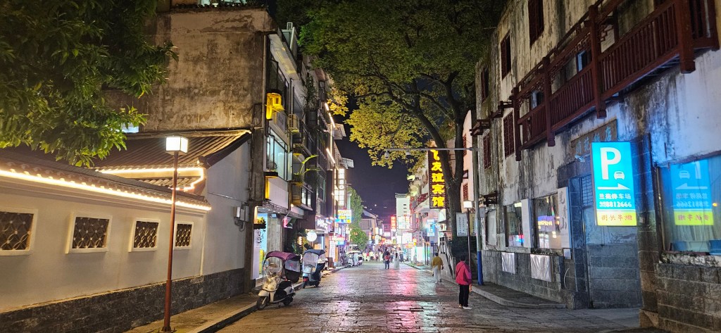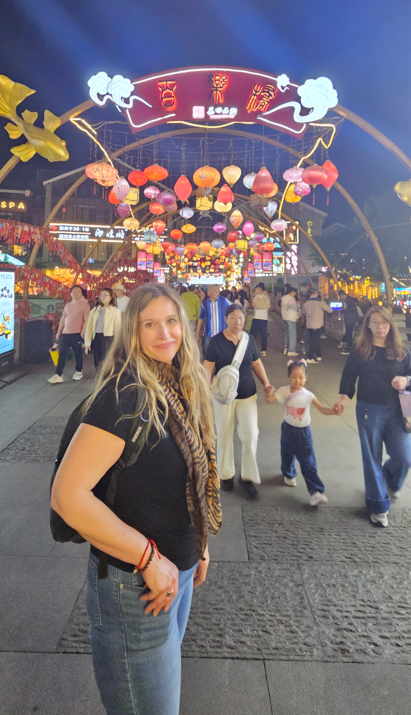 The next night we had dinner at the hotel restaurant, then took a trip to the happening part of town, known as Yangshou West Street. We arrived to a lot of hustle and bustle, and so many people, it was a bit overwhelming (as you can see in my face).